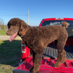 Baxter is a chocolate Standard Poodle, he just turned a year old a few months ago and although he weighs 75 pounds, he is the baby of the group. We will be outside sitting, and he will jump up in the chair with you and sit on your lap just like he did when little. He is not only the baby of the group, but he is our baby and if I go anywhere and take a dog with me it is always Baxter because he loves everybody, and everybody loves him.
