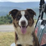 Molly is a brown/white tri–Australian Shepherd, she is two years old and is the most intelligent dog that we have. She is a magician; she can get out of anything you try to put her in. She loves to go on rides side by side, she sometimes likes to hike but it depends on the weather lol. She has had two litters of puppies with colors ranging from black to brown, and even brown and white, and many of them inherited her beautiful crystal blue eyes.