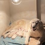Bella is a Great Pyrenees, she is seven years old and was the first dam we had bought when we started. Before she started having Pyredoodles she was the mom to four litters of Great Pyrenees puppies, and she had some pretty ones! She is the only Great Pyrenees that we have that has black Pyredoodles, which originates from her badger markings, which is color that is on the dog other than just white. She will not have but a couple more litters, but she has been a really good dog for us and our business.
